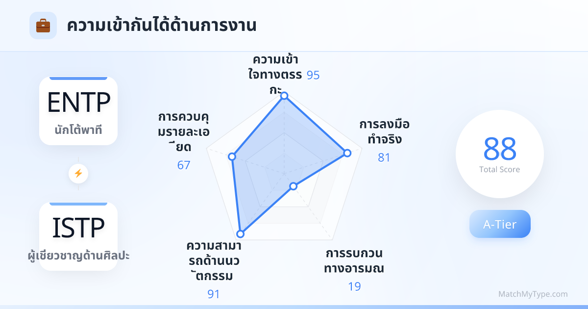 ที่สุดของวงจรตรรกะที่สมบูรณ์ ENTP เก่งในการวางแผนกลยุทธ์มหภาคและนวัตกรรม (Ne) สามารถมองเห็นแนวโน้มในอนาคต ISTP เก่งในการลงมือทำระดับจุลภาคและกำจัดจุดบกพร่อง (Se-Ti) สามารถเห็นช่องโหว่ในปัจจุบัน เมื่อ ENTP บอกว่า 'เราจะสร้างจรวดไปดาวอังคาร' ISTP จะไม่ถามว่าทำไม แต่จะหยิบประแจขึ้นมาแล้วพูดว่า 'งั้นต้องแก้พารามิเตอร์ของเครื่องยนต์ตัวนี้'