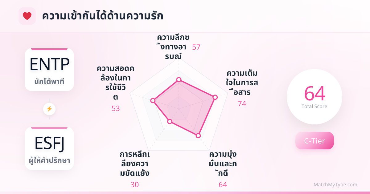 นี่คือความสัมพันธ์ที่เต็มไปด้วยพลัง ทั้ง ENTP และ ESFJ อยู่ใน 'กลุ่ม Alpha' ของ MBTI ซึ่งหมายความว่าพวกคุณใช้ฟังก์ชันสี่อย่างเหมือนกันเป๊ะ (Ne, Ti, Fe, Si) เพียงแต่เรียงลำดับต่างกัน เหมือนพวกคุณถือเครื่องดนตรีชนิดเดียวกันแต่เล่นเพลงคนละสไตล์ ENTP นำมาซึ่งความประหลาดใจและความวุ่นวาย ส่วน ESFJ นำมาซึ่งความอบอุ่นและระเบียบ ชีวิตพวกคุณจะไม่มีวันน่าเบื่อแน่นอน
