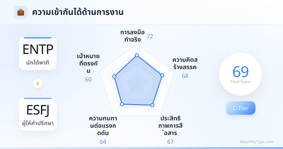 นี่คือส่วนผสมของ 'นักฝัน' และ 'นักปฏิบัติ' ในที่ทำงาน หากแบ่งงานกันได้ดี พวกคุณจะเป็นทีมที่ไร้เทียมทาน: ENTP รับหน้าที่วาดฝัน สร้างนวัตกรรม แก้ปัญหาทางเทคนิคที่ยากๆ ส่วน ESFJ รับหน้าที่แบ่งงาน สร้างทีม และทำให้แน่ใจว่าโปรเจกต์จะสำเร็จตามกำหนดเวลา