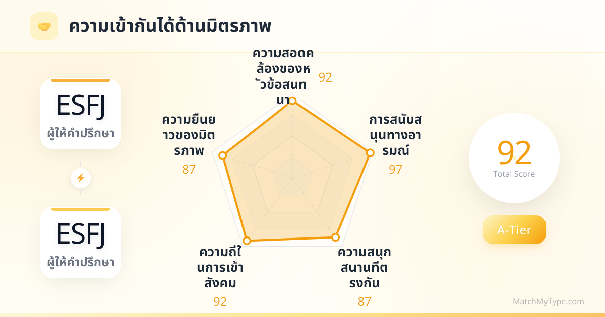 การรวมตัวของ ESFJ และ ESFJ คือหนึ่งในการจับคู่ที่ "ติดดิน" และอบอุ่นที่สุดใน MBTI พวกคุณไม่จำเป็นต้องใช้คำพูดลองเชิงกันมากนัก เพราะพวกคุณใช้สคริปต์ทางสังคมและค่านิยมชุดเดียวกัน นี่คือสายสัมพันธ์ที่ลึกซึ้งซึ่งตั้งอยู่บนพื้นฐานของ "ความรู้สึกปลอดภัย" และ "ความรู้สึกเป็นส่วนหนึ่ง" พวกคุณจะร่วมกันสร้างป้อมปราการครอบครัวที่ไม่อาจสั่นคลอนได้