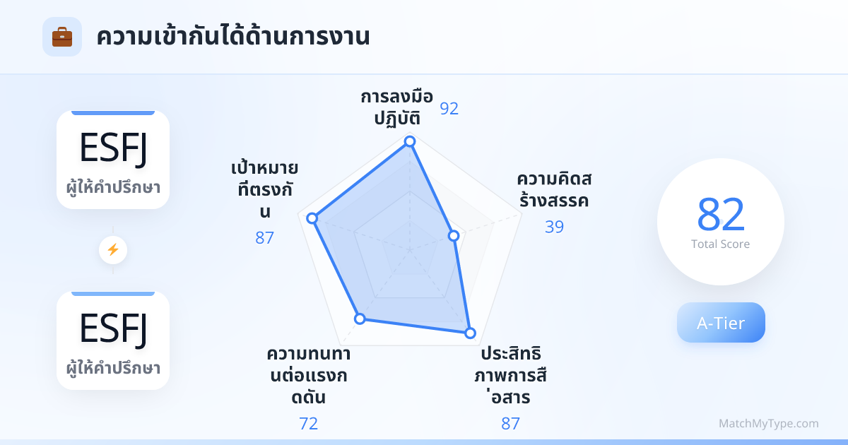 หากในทีมมี ESFJ สองคน ประสิทธิภาพการบริหารจัดการ การจัดกิจกรรม และบรรยากาศในทีมจะอยู่ในระดับท็อป พวกคุณคือผู้ปฏิบัติงานและกาวประสานใจโดยธรรมชาติ แต่เมื่อต้องการการปฏิรูปครั้งใหญ่หรือการวางแผนเชิงกลยุทธ์ที่เป็นนามธรรม พวกคุณอาจจะเจอทางตัน