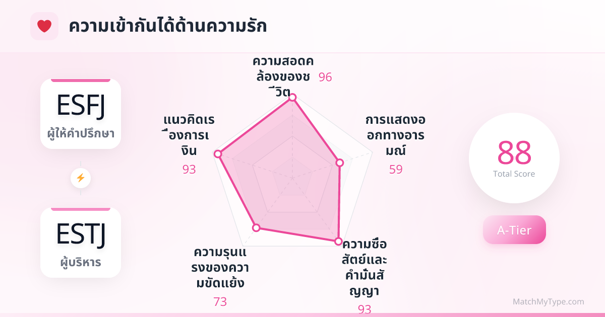 ทั้งคู่เป็นประเภท SJ (Guardians) ซึ่งหมายความว่าคุณมีระบบปฏิบัติการพื้นฐานที่เหมือนกัน: ให้ความสำคัญกับประเพณี เคารพกฎเกณฑ์ และโหยหาความมั่นคง ESFJ จะถูกดึงดูดโดยความเด็ดขาด ความสามารถ และความรับผิดชอบของ ESTJ โดยมองเห็นที่พึ่งพาที่จะช่วยประคับประคองทุกอย่างได้ ส่วน ESTJ จะประทับใจในความกระตือรือร้น ความใส่ใจ และความฉลาดทางสังคมที่สูงมากของ ESFJ โดยมองเห็นคู่ชีวิตที่สมบูรณ์แบบที่จะมาดูแลหลังบ้านและรักษาชื่อเสียงของตระกูล คุณทั้งคู่ไม่ชอบ 'เซอร์ไพรส์' (ซึ่งมักถูกมองว่าเป็นเรื่องน่าตกใจ) และชอบทำตามแผน ซึ่งช่วยขจัดความขัดแย้งในความสัมพันธ์ไปได้ถึง 90%