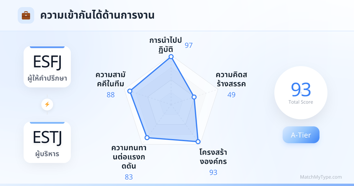ในที่ทำงาน การจับคู่ระหว่าง ESFJ และ ESTJ คือตำราแห่ง 'การนำไปปฏิบัติให้เกิดผล' คุณไม่จำเป็นต้องพูดอะไรมากก็เข้าใจกันได้ฝ่ายหนึ่งรับหน้าที่กำหนดกฎเกณฑ์และกระบวนการ อีกฝ่ายรับหน้าที่สร้างความสามัคคีและรักษาความสัมพันธ์ ตราบใดที่ไม่ใช่โครงการที่ต้องใช้นวัตกรรมแบบพลิกฟ้าพลิกดิน คุณคือคู่หูที่ไร้เทียมทาน