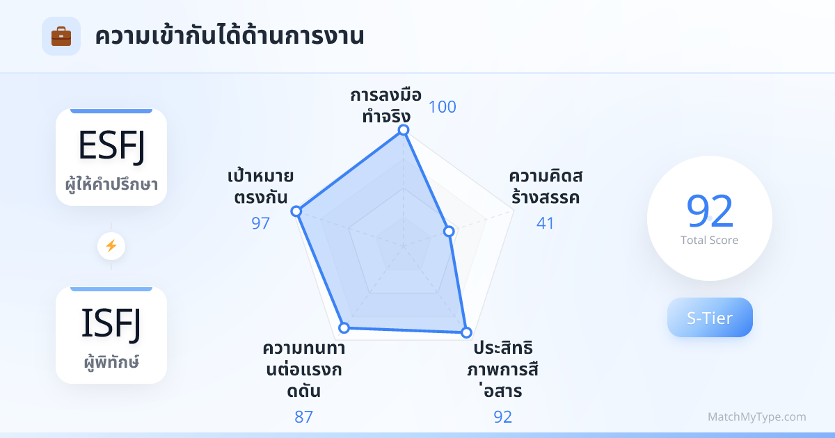 นี่คือเกมของ 'การสะท้อนและเติมเต็ม': **คู่บรรเลงระหว่าง Fe (ความรู้สึกแบบแสดงออก) และ Si (การรับรู้แบบเก็บตัว)**: ทั้งคู่มีฟังก์ชันหลักสองอย่างนี้ เพียงแต่ลำดับต่างกัน ESFJ (นำด้วย Fe) รับผิดชอบการรักษาความสัมพันธ์ทางสังคมและสร้างบรรยากาศ เหมือนดั่งแสงสว่าง ISFJ (นำด้วย Si) รับผิดชอบการจดจำรายละเอียดและการรักษาความเป็นระเบียบภายใน เหมือนดั่งแบตเตอรี่สำรอง Fe ของ ESFJ โหยหาการยอมรับ ซึ่ง Fe ของ ISFJ ก็เก่งในการให้ความร่วมมือและสนับสนุนพอดี ส่วน Si ของ ISFJ ที่แสวงหาความมั่นคง ก็ได้รับการเข้าใจอย่างลึกซึ้งจาก Si ของ ESFJ ที่ยึดมั่นในความแน่นอนเช่นกัน **การสั่นสะท้อนของจุดอ่อน Ti (การคิดแบบเก็บตัว) และ Ne (สัญชาตญาณแบบแสดงออก)**: ทั้งคู่ค่อนข้างอ่อนในด้านการวิเคราะห์ตรรกะ (Ti) และการสำรวจแนวนามธรรม (Ne) นั่นหมายความว่าคุณแทบจะไม่ทะเลาะกันเรื่อง 'ความถูกต้องของตรรกะ' หรือ 'จินตนาการที่ไม่เป็นจริง' แต่ก็อาจติดอยู่ในเซฟโซนที่ 'ขาดความแปลกใหม่' ได้ง่ายๆ
