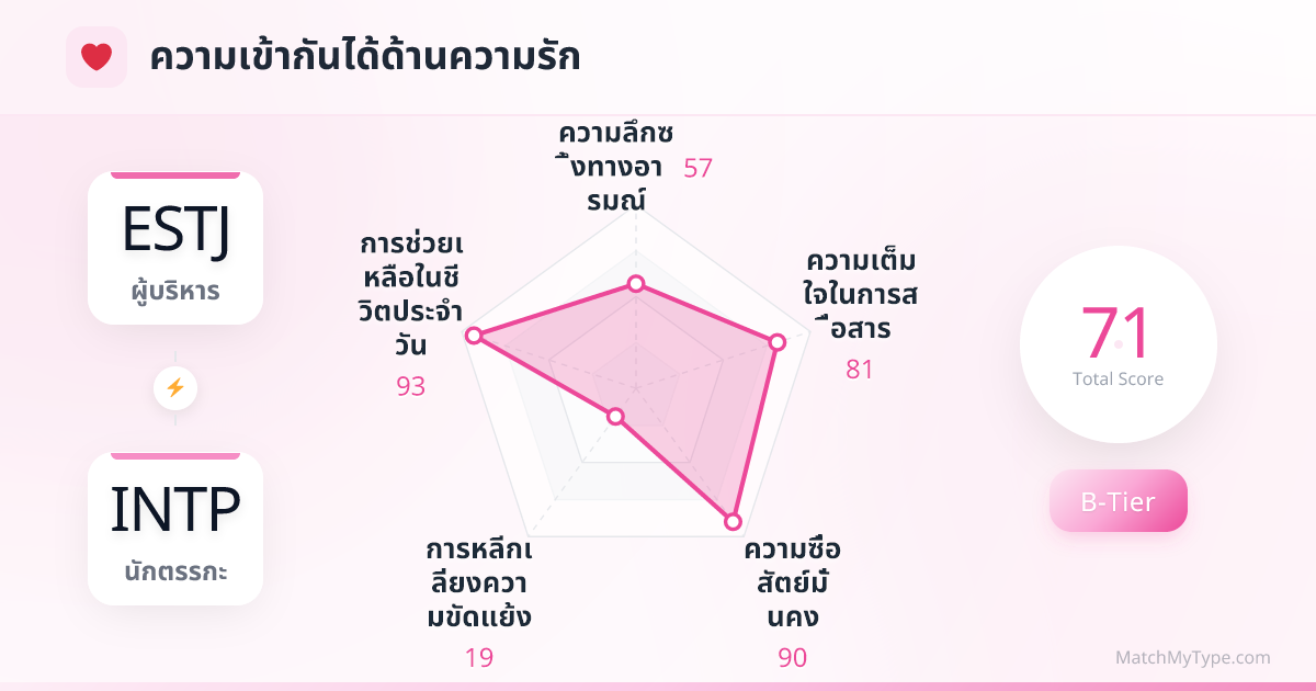 นี่ไม่ใช่ละครรักโรแมนติกที่เต็มไปด้วยดอกไม้และแสงเทียน แต่เป็นภาพยนตร์ไซไฟแนวฮาร์ดคอร์ ความสัมพันธ์ระหว่าง ESTJ และ INTP มักเริ่มจากการชื่นชมในสติปัญญาของกันและกัน ESTJ ชื่นชมจินตนาการและความสามารถในการวิเคราะห์ที่น่าทึ่งของ INTP ส่วน INTP ก็พึ่งพาความสามารถในการจัดการชีวิตและความสำเร็จในโลกความเป็นจริงของ ESTJ นี่คือความสัมพันธ์แบบต่างตอบแทนที่ว่า 'ฉันช่วยคุณจัดการชีวิต คุณช่วยให้ฉันเห็นแก่นแท้ของสิ่งต่างๆ'