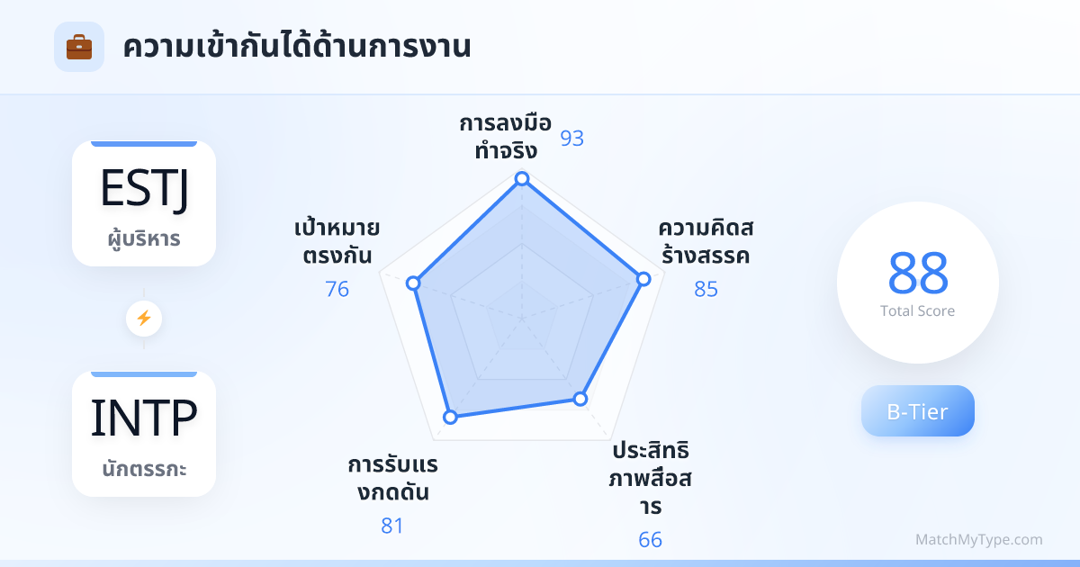 นี่คือการจัดตั้ง 'ทีมในฝัน' ในที่ทำงาน ภายใต้เงื่อนไขที่ว่าทั้งคู่ต้องมีความเป็นผู้ใหญ่ INTP คือสมองที่ทรงพลังที่สุด (สถาปนิก) และ ESTJ คือมือเท้าที่แข็งแกร่งที่สุด (ผู้จัดการโครงการ) ตราบใดที่ไม่แย่งพวงมาลัยกัน รถคันนี้จะวิ่งไปได้อย่างเร็วและมั่นคง