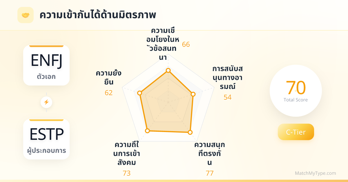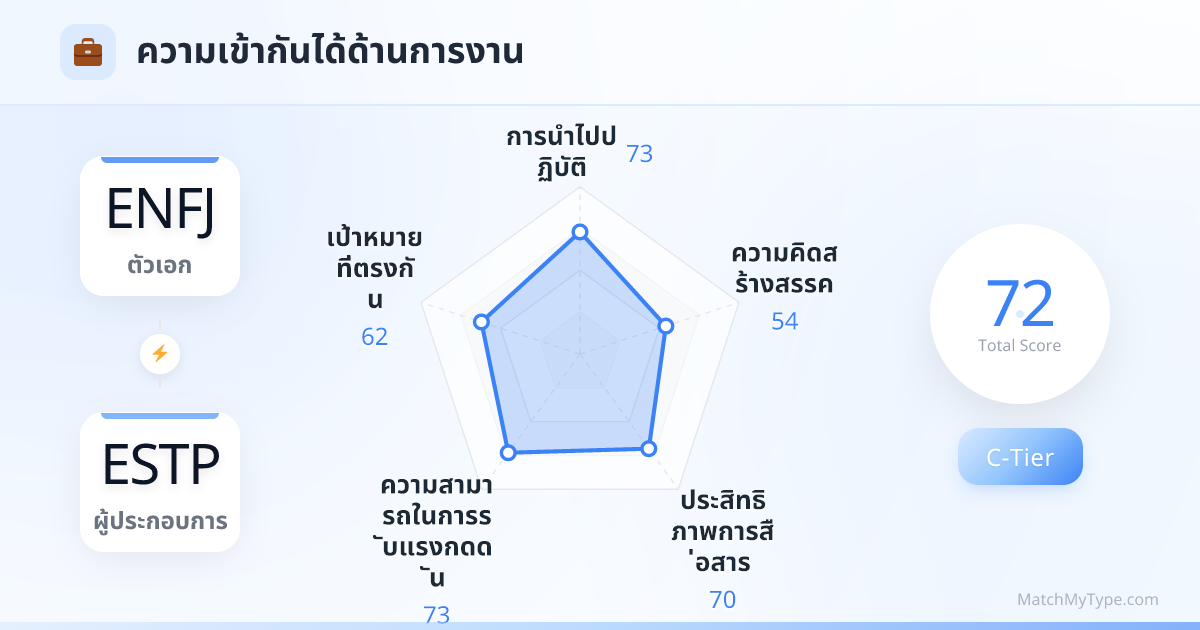 นี่คือการรวมพลังระหว่าง 'นักสร้างฝัน' และ 'นักปฏิบัติ' ENFJ ถนัดการวาดวิสัยทัศน์และสร้างความสามัคคีในทีม (การสร้างโอกาส) ส่วน ESTP ถนัดการแก้ไขวิกฤตและจัดการลูกค้า (การคว้าโอกาส) ตราบใดที่มีเป้าหมายเดียวกัน คุณทั้งคู่ก็เปรียบเสมือนรถแทรกเตอร์ที่กวาดล้างทุกอย่างในตลาด