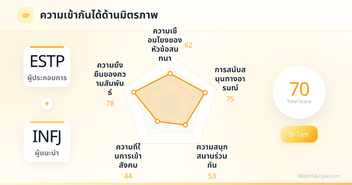 อยู่กันคนละคลื่นโดยสิ้นเชิง ESTP คือผีเสื้อราตรี ชอบที่ที่มีคนเยอะๆ ส่วน INFJ คือนักสังเกตการณ์ที่กลัวสังคม เห็นคนเยอะๆ ก็อยากหนี ในฐานะเพื่อน โหมดการเจอกันที่ดีที่สุดคือ 'แบบตัวต่อตัว' หรือ 'กลุ่มเล็กๆ' หาก ESTP จะลาก INFJ ไปไนท์คลับ โปรดอนุญาตให้ INFJ นั่งดื่มและสังเกตผู้คนอยู่ที่มุมเงียบๆ อย่าไปบังคับให้พวกเขาออกไปเต้นกลางฟลอร์