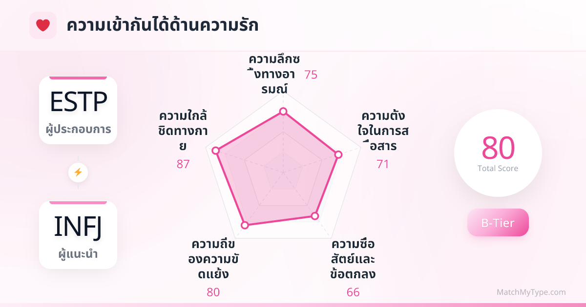**ความตรงไปตรงมาของ ESTP**: ESTP มักพูดโดยไม่ผ่านการกลั่นกรองและแทงใจดำ ซึ่งอาจทำร้าย INFJ ที่อ่อนไหวง่ายได้ง่าย จนทำให้ INFJ แอบจดจำความแค้นหรือปิดใจ