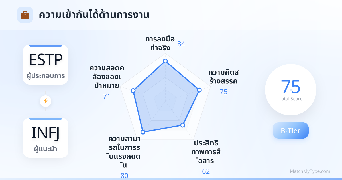 ESTP ต้องเข้าใจว่าความ 'ช้า' ของ INFJ คือการจำลองสถานการณ์ในสมอง แทนที่จะเร่ง ให้ลองถามว่า 'คุณกำลังกังวลความเสี่ยงอะไรอยู่หรือเปล่า?' เพื่อช่วย INFJ คลายความกังวล เมื่อ INFJ มั่นใจว่าเส้นทางนั้นปลอดภัย พลังการทำงานของพวกเขาก็ไม่ได้ด้อยไปกว่าใครเลย