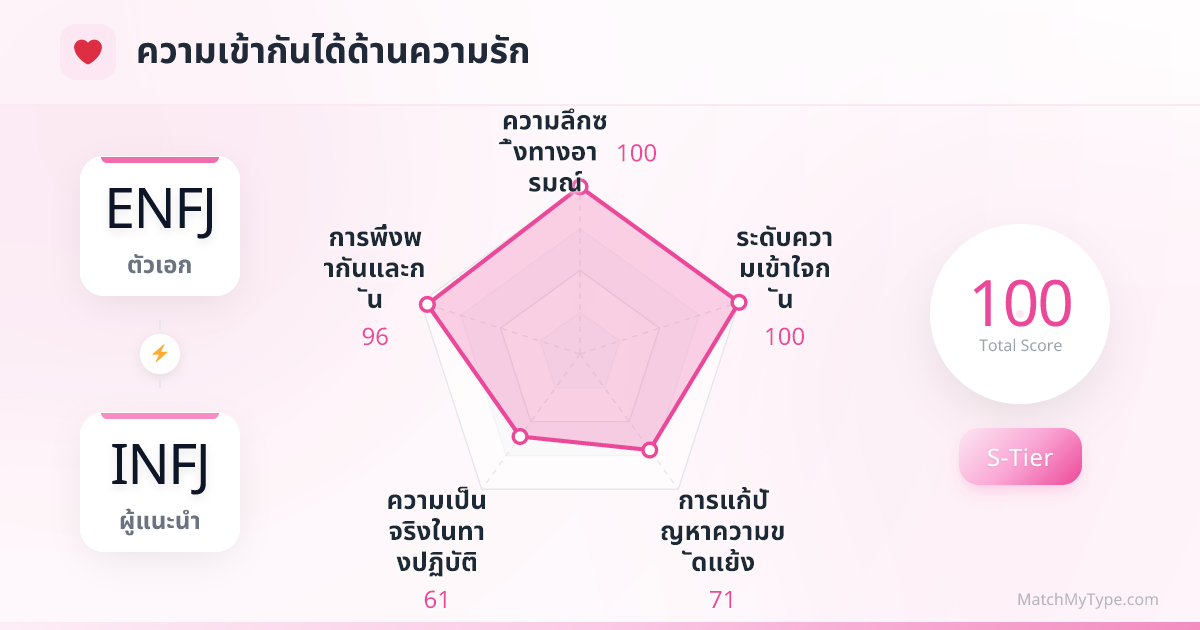ความสัมพันธ์ ENFJ x INFJ ที่เป็นผู้ใหญ่คือการเรียนรู้ว่า 'ถึงแม้เราจะใจตรงกัน แต่เราก็ต้องมีพื้นที่ส่วนตัว' ENFJ เรียนรู้ที่จะหาพลังงานทางสังคมจากภายนอกโดยไม่พึ่งพา INFJ เพียงอย่างเดียว และ INFJ เรียนรู้ที่จะสื่อสารความต้องการอย่างตรงไปตรงมาแทนที่จะปล่อยให้ ENFJ คาดเดา
