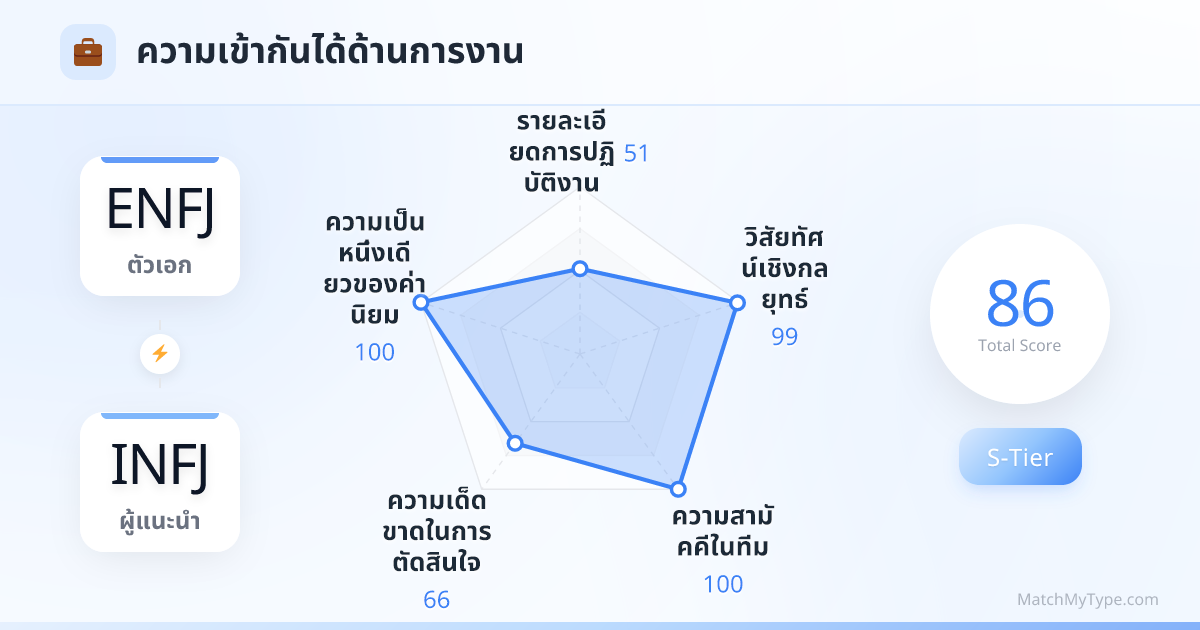 ความสามารถในการทำให้วิสัยทัศน์เป็นจริงแบบ 1+1>2 INFJ เก่งในการสร้างกลยุทธ์และความเข้าใจที่ลึกซึ้งจากเบื้องหลัง (Ni) ส่วน ENFJ เก่งในการนำความคิดที่ซับซ้อนเหล่านั้นมาแปลเป็นภาษาที่เข้าใจง่ายและสร้างแรงบันดาลใจเพื่อสื่อสารแก่สาธารณะ (Fe) ในด้านการศึกษา การให้คำปรึกษา HR ประชาสัมพันธ์ และองค์กรไม่แสวงหากำไร คุณคือคู่หูทองคำ
