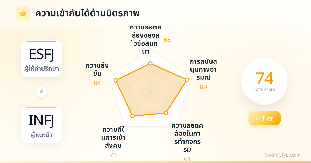 ESFJ ถักทอข่ายความปลอดภัยในความเป็นจริง ในขณะที่ INFJ จุดไฟประภาคารให้แก่จิตวิญญาณ นี่คือพันธสัญญาอันอ่อนโยนระหว่างปุถุชนที่อบอุ่นที่สุดและนักพรตที่เข้าใจโลกที่สุด