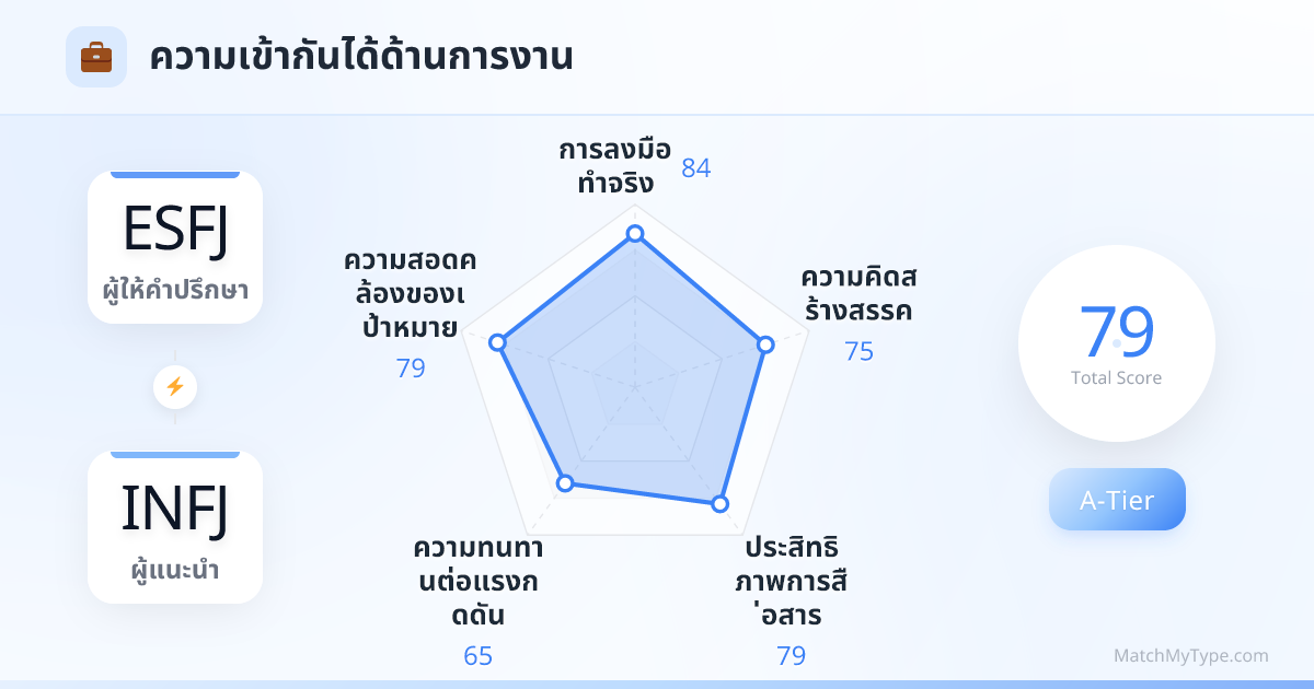 คู่หูที่ดีที่สุด ในโครงการหนึ่ง INFJ รับผิดชอบการวางแผนและไอเดียสร้างสรรค์ ESFJ รับผิดชอบการทำ PPT การนำเสนอ การติดต่อลูกค้า และการจัดการความคืบหน้า จำไว้ว่าอย่าให้ INFJ ทำงานซ้ำซากที่เน้นการปฏิบัติเพียงอย่างเดียว และอย่าให้ ESFJ ทำงานวิจัยที่ต้องใช้ตรรกะเชิงนามธรรมที่ซับซ้อนเกินไป