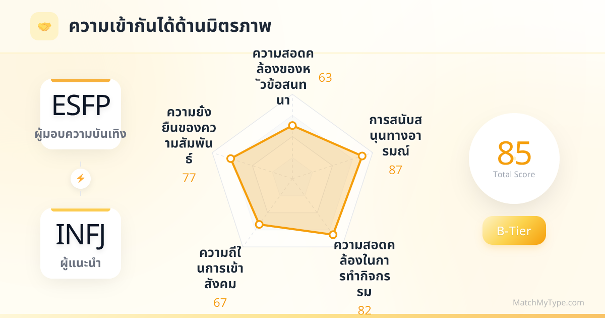 - 3**พลังงานทางสังคมที่ไม่เท่ากัน**: ESFP ลาก INFJ ไปปาร์ตี้ห้าชั่วโมง เมื่อ INFJ พลังหมดและเริ่มหน้าบึ้ง ESFP จะรู้สึกกร่อย และทั้งสองก็จบลงด้วยความไม่พอใจ