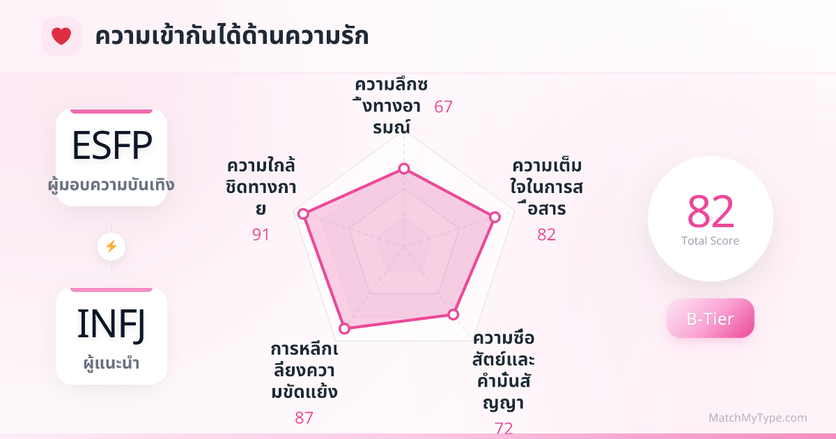 นี่คือคู่รักที่ “เติมเต็มซึ่งกันและกัน” อย่างแท้จริง ESFP เปรียบเสมือนแสงเลเซอร์สีสันสดใสที่สาดส่องเข้ามาในโลกที่หม่นหมองของ INFJ ส่วน INFJ คือท่าเรืออันเงียบสงบที่ ESFP ปรารถนาจะกลับมาหลังจากชีวิตที่วุ่นวาย แรงดึงดูดนี้มักเริ่มต้นจากความอยากรู้อยากเห็น แต่ต้องการความอดทนอย่างมหาศาลเพื่อรักษาความสัมพันธ์ไว้