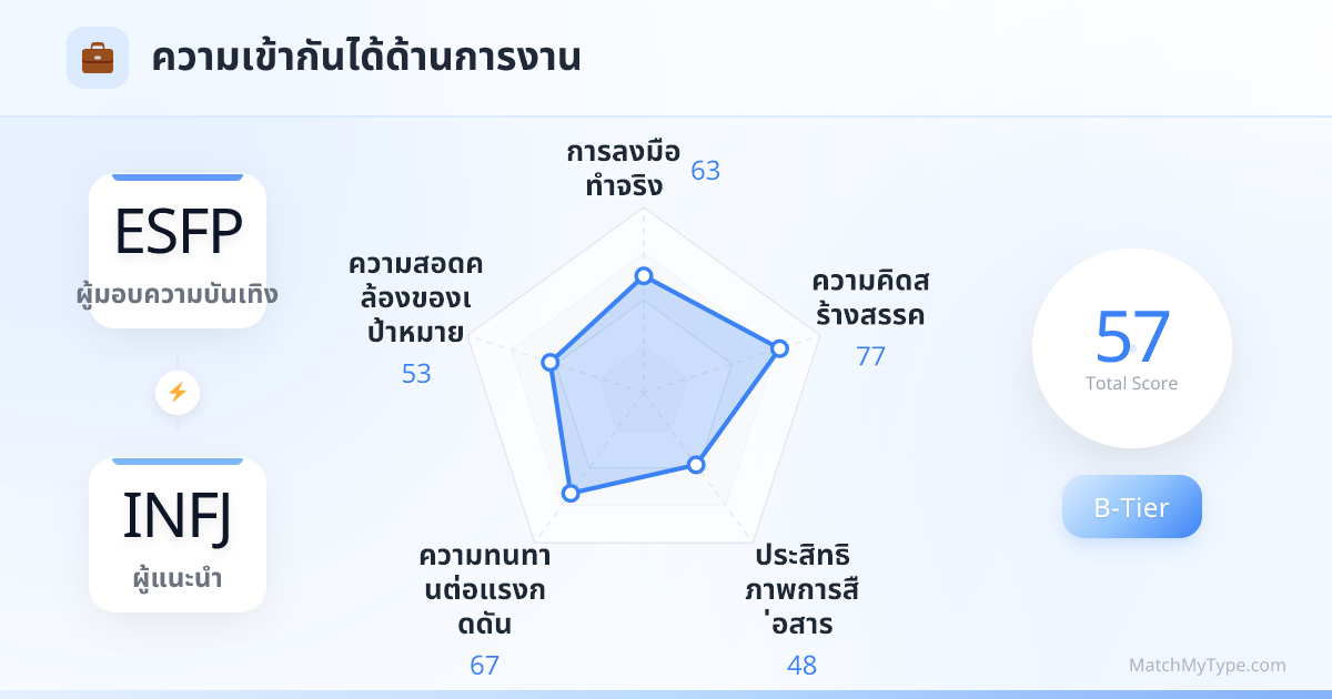 เติมเต็มแต่ต้องปรับตัว แนะนำให้แบ่งงานตามกายภาพ: งานที่ต้องพบปะผู้คน งานภาคสนาม หรืองานสร้างบรรยากาศให้ ESFP ทำ ส่วนงานเขียนเอกสาร วางแผน หรืองานวิเคราะห์ให้ INFJ ทำ พยายามหลีกเลี่ยงการให้ทั้งคู่ทำงานตรวจสอบข้อมูลที่ต้องใช้ตรรกะที่เข้มงวดร่วมกัน