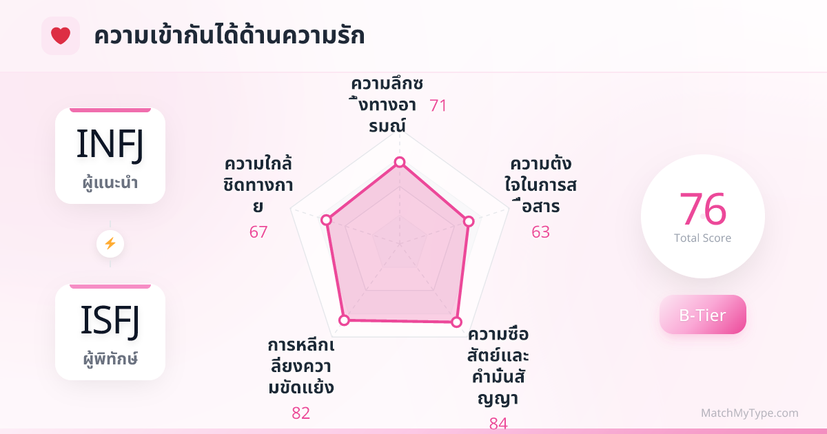 นี่คือการพบกันระหว่าง 'นักอุดมคติ' และ 'ผู้พิทักษ์ความเป็นจริง' INFJ มักจะรู้สึกล่องลอยและวิตกกังวลเนื่องจากการคิดมากเกินไป ในขณะที่ความเป็นระเบียบในชีวิตที่มั่นคงอย่างยิ่งของ ISFJ (Si) สามารถเป็นเหมือนสมอเรือที่ดึง INFJ กลับมาสู่พื้นโลก คอยเตรียมข้าวอุ่นๆ เสื้อผ้าที่พอเหมาะ และการดูแลที่เป็นรูปธรรมที่สุด ส่วน ISFJ ที่คุ้นเคยกับการทุ่มเทเงียบๆ แต่กลับถูกมองข้าม จะได้รับการมองเห็นจาก INFJ ที่มีสายตาเฉียบคมซึ่งสามารถจับอารมณ์ที่เปลี่ยนแปลงและการทุ่มเทที่ซ่อนอยู่ของ ISFJ ได้ทันที และให้การยอมรับอย่างสูง ความตื้นตันที่ว่า 'ในที่สุดสิ่งที่ฉันทำก็มีคนเห็น' คือรากฐานของความสัมพันธ์ของทั้งคู่