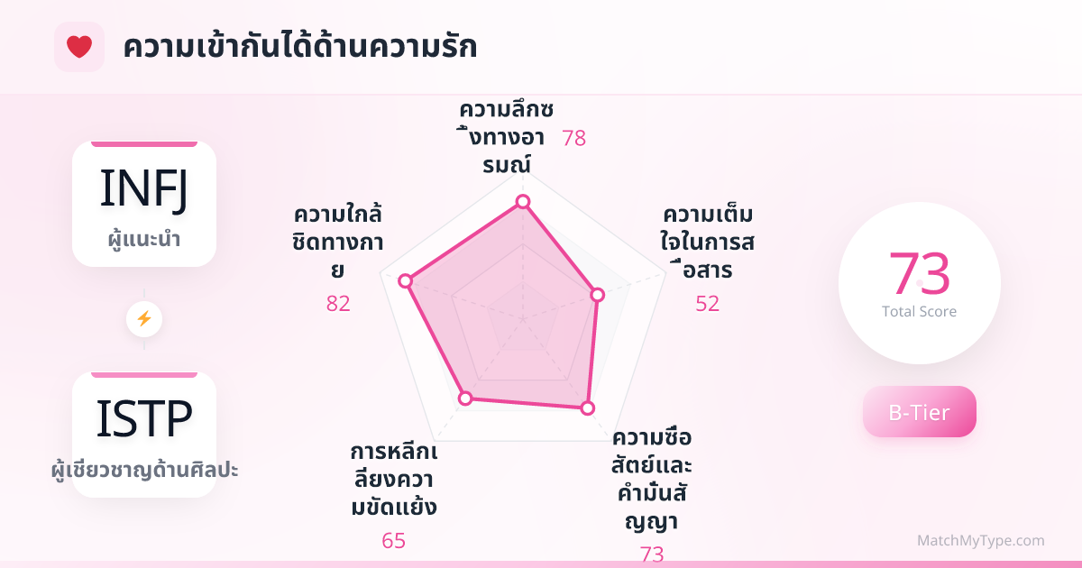 สิ่งที่น่าสนใจคือ พวกคุณมีสี่ฟังก์ชันที่เหมือนกันทุกประการ แต่เรียงลำดับตรงกันข้าม: **Ni (สัญชาตญาณภายใน) & Fe (ความรู้สึกภายนอก) vs Ti (การคิดภายใน) & Se (การรับรู้ภายนอก)**: INFJ มักจะมองหาความหมายในอนาคตก่อน (Ni) แล้วค่อยพิจารณาความรู้สึกของผู้คน (Fe); ในขณะที่ ISTP มักจะวิเคราะห์ตรรกะก่อน (Ti) แล้วค่อยสัมผัสกับสิ่งเร้าทางประสาทสัมผัสในปัจจุบัน (Se) **จุดเติมเต็ม**: INFJ มักจะล่องลอยอยู่ในก้อนเมฆและติดอยู่ในวงจรของความวิตกกังวล Se ที่แข็งแกร่งของ ISTP สามารถดึง INFJ กลับมาสู่พื้นดินและบอกเขา/เธอว่า 'หยุดคิดแล้วไปกินข้าวกันก่อน' ISTP มักจะติดอยู่กับการใช้ชีวิตที่เป็นกลไกหรือความว่างเปล่าทางอารมณ์ Fe ของ INFJ สามารถทำให้หัวใจที่เป็นกลไกของ ISTP อบอุ่นขึ้น และสอนให้พวกเขารู้จักการแสดงออกถึงความรัก **จุดขัดแย้ง**: เมื่อ INFJ ต้องการการสื่อสารทางอารมณ์ที่ลึกซึ้ง (Fe) ISTP อาจใช้ตรรกะที่เย็นชา (Ti) มาแก้ปัญหา ทำให้ INFJ รู้สึกว่าอีกฝ่าย 'ไม่มีหัวใจ'