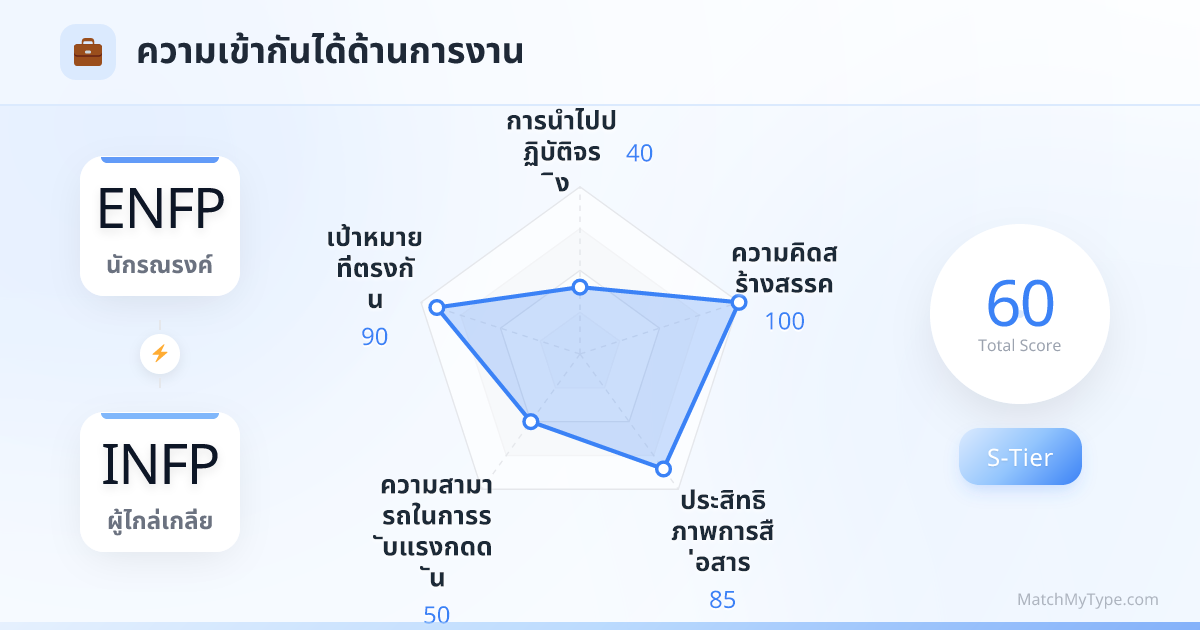 - 3**พฤติกรรมดื้อเงียบ**: เมื่อ INFP ไม่พอใจมักจะเก็บงำไว้ ENFP สัมผัสได้ถึงความผิดปกติแต่ไม่รู้สาเหตุจึงเริ่มสติแตก ทั้งสองฝ่ายจำเป็นต้องเรียนรู้ที่จะสื่อสารความต้องการอย่างตรงไปตรงมา แทนที่จะให้อีกฝ่ายคาดเดาเอง