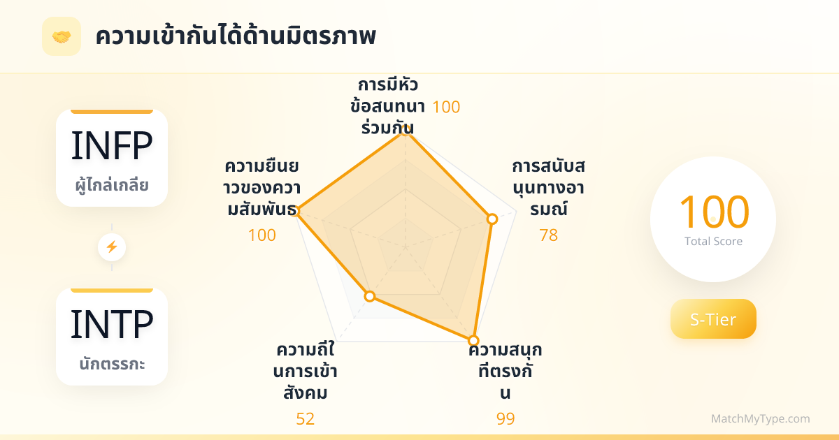 นี่คือเรื่องราวของ 'หุ่นยนต์ที่อบอุ่นที่สุด' พบกับ 'เอลฟ์ที่มีเหตุผลที่สุด' INFP จะถูกดึงดูดด้วยความจริงใจที่บริสุทธิ์ ไม่ปรุงแต่ง และความฉลาดหลักแหลมของ INTP โดยรู้สึกว่าอีกฝ่ายเป็นคนเดียวในโลกที่ไม่เสแสร้ง ส่วน INTP จะหลงใหลในโลกแห่งอารมณ์ที่รุ่มรวยและรสนิยมที่เป็นเอกลักษณ์ของ INFP เพราะ INFP เป็นเพียงไม่กี่คนที่ก้าวทันความคิดที่ก้าวกระโดดของ INTP และไม่มองว่าพวกเขา 'แปลก' เมื่ออยู่ด้วยกัน พวกคุณสามารถคุยกันได้ตั้งแต่เรื่องฟิสิกส์ควอนตัมไปจนถึงเรื่องมื้อเย็น ความต่อเนื่องทางสติปัญญานี้เป็นเสน่ห์ที่ดึงดูดใจอย่างมาก
