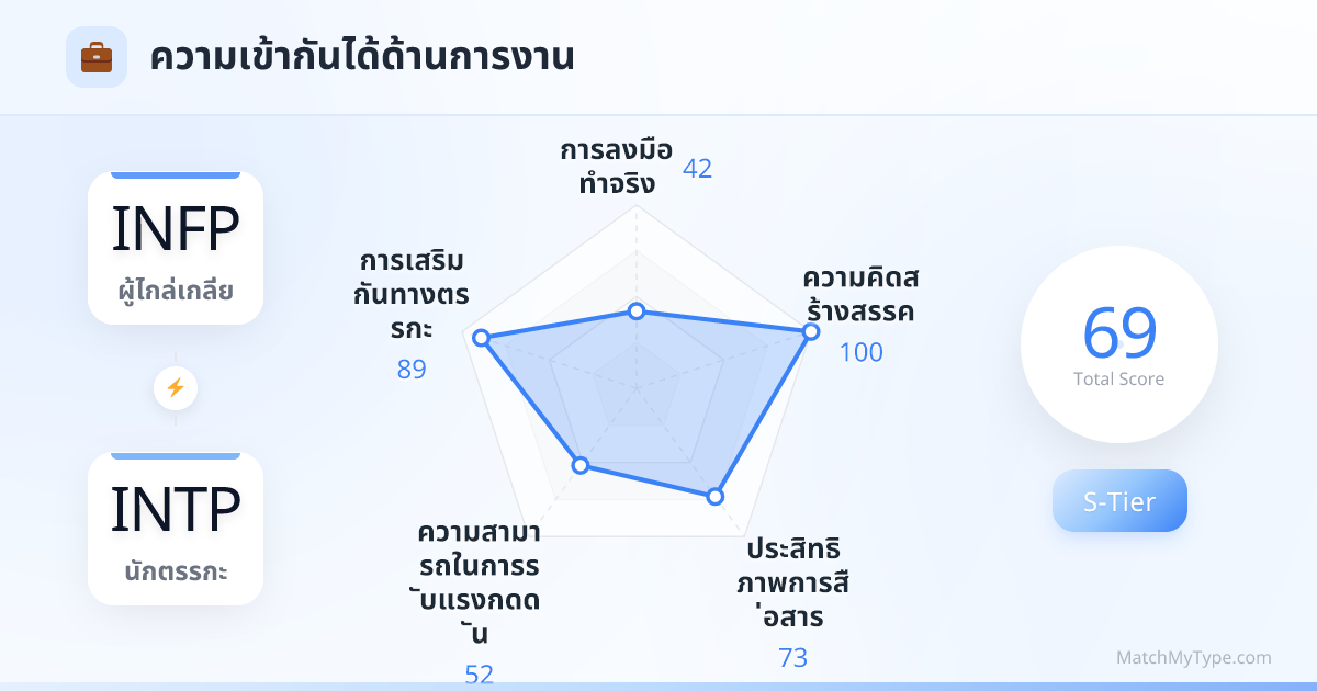 นิวเคลียร์ฟิวชันทางความคิด INFP มอบค่านิยมที่เน้นคนเป็นศูนย์กลางและสัญชาตญาณทางสุนทรียภาพ ส่วน INTP มอบโครงสร้างตรรกะที่รัดกุมและแนวทางการนำทางเทคนิค ในด้านการออกแบบผลิตภัณฑ์ งานเขียน การสร้างสรรค์ศิลปะ หรืองานวิจัยทางวิชาการ พวกคุณสามารถผลิตผลงานระดับท็อปที่มีทั้งความลึกซึ้งและความอบอุ่น