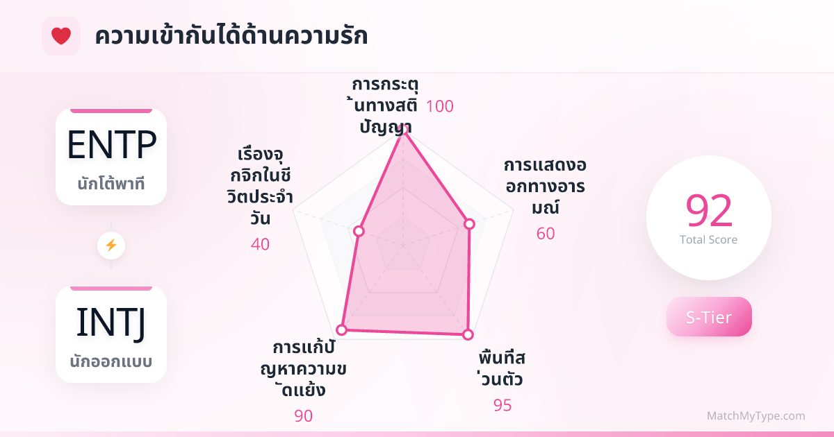 สำหรับคู่ NT คู่นี้ เซ็กส์คือรูปแบบหนึ่งของการสำรวจและการทดลอง พวกคุณไม่ชอบความจำเจและยินดีที่จะลองสิ่งใหม่ๆ ในห้องนอน INTJ ที่ปกติจะดูเย็นชาอาจแสดงพลังในการควบคุมที่น่าทึ่งหรือความเร่าร้อนที่แตกต่างจากภาพลักษณ์ภายนอกอย่างสิ้นเชิง ขณะที่ ENTP จะเป็นผู้ให้ความร่วมมือที่เต็มไปด้วยความคิดสร้างสรรค์ ที่สำคัญกว่านั้น หลังจากกิจกรรมที่ใกล้ชิด พวกคุณมักจะมี 'Pillow Talk' ที่ลึกซึ้ง ตั้งแต่เรื่องทฤษฎีบิกแบงไปจนถึง AI ซึ่งความพึงพอใจทั้งทางร่างกายและสติปัญญานี้เองที่เป็นกุญแจสำคัญในการรักษาความสัมพันธ์