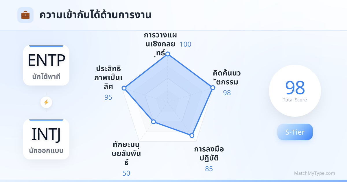 นี่คือ 'ทีมในฝัน' ในที่ทำงาน และเป็นคู่หูนักนวัตกรรมที่ทรงพลังที่สุด ENTP รับหน้าที่ทำลายกฎเกณฑ์เก่าๆ และ INTJ รับหน้าที่สร้างระเบียบใหม่ ตราบใดที่เป้าหมายตรงกัน ไม่มีอุปสรรคใดขวางพวกคุณได้ แต่ถ้าเป้าหมายไม่ตรงกัน การห้ำหั่นกันเองจะเป็นระดับหายนะ