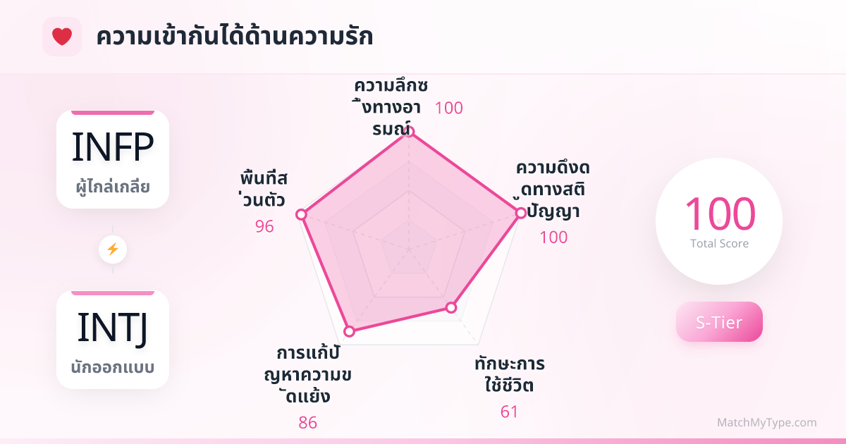 INFP คือคนเพียงคนเดียวที่สามารถอ่านความรักอันลึกซึ้งภายใต้ความเงียบงันของ INTJ ออก และ INTJ คือคนเพียงคนเดียวที่จะช่วยเนรมิตความฝันอันงดงามของ INFP ให้กลายเป็นความจริงได้