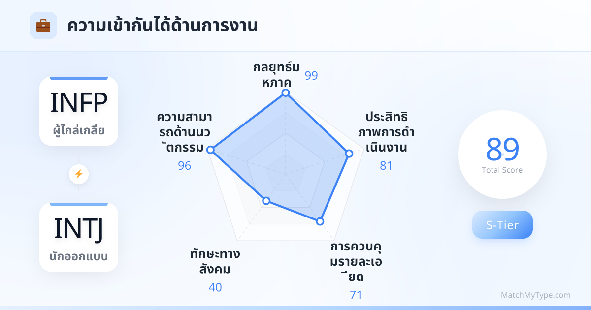 ในที่ทำงาน นี่คือการรวมตัวกันของ 'นักยุทธศาสตร์และผู้มองการณ์ไกล' INTJ รับผิดชอบในการสร้างระบบและวางกลยุทธ์ ส่วน INFP รับผิดชอบในการมอบคุณค่าทางมนุษยธรรมและสุนทรียภาพให้กับผลิตภัณฑ์ ตราบใดที่ไม่ก้าวก่ายงานในสายอาชีพของกันและกัน คุณจะสามารถสร้างผลงานที่มีทั้งประสิทธิภาพและน่าประทับใจ