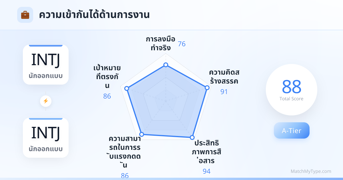 นี่คือรูปแบบหนึ่งของการ 'รักตัวเอง' INTJ ใช้ชีวิตทั้งชีวิตเพื่อตามหาใครสักคนที่สามารถก้าวทันความเร็วของความคิดตนเอง เข้าใจมุกเฉพาะทาง และสุดท้ายก็พบว่ามีเพียง INTJ อีกคนเท่านั้นที่ทำได้ แรงดึงดูดนี้เกิดจาก 'ความปลอดภัยทางปัญญา' ที่หาได้ยาก คุณไม่จำเป็นต้องอธิบายมุกตลก ไม่ต้องขอโทษที่เย็นชา และไม่ต้องซ่อนความทะเยอทะยาน ในตัวของอีกฝ่าย คุณจะเห็นตัวเองที่โลกไม่เข้าใจ และความรู้สึกเหมือนส่องกระจกนี้ก็นำมาซึ่งความรู้สึกเป็นเจ้าของอย่างลึกซึ้ง
