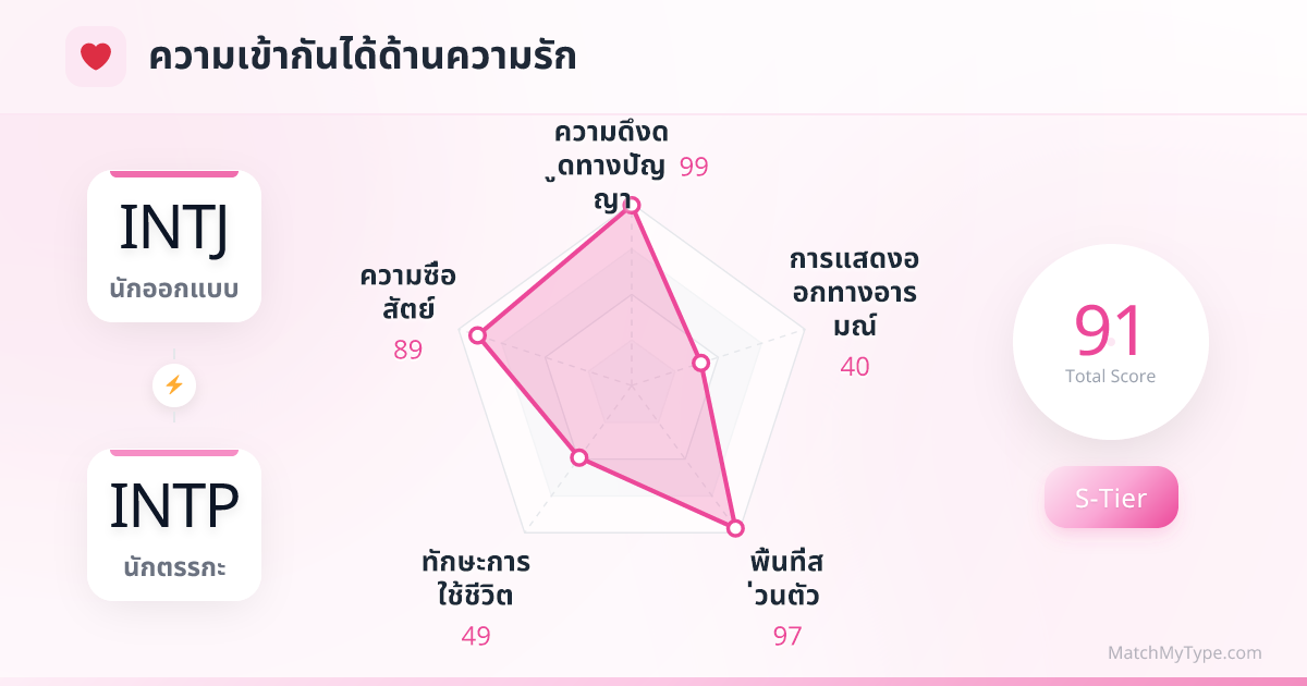 การรวมตัวของ INTJ และ INTP มักถูกเรียกว่า "คู่ทองคำ" หรือ "คู่เงา" นี่ไม่ใช่ความรักในโลกฆราวาสที่มีแต่ดอกไม้และช็อกโกแลต แต่เป็นการ "แต่งงานทางสมอง" ที่อิงจากการต่อสู้ทางปัญญาและการชื่นชมในความสามารถของกันและกัน สำหรับพวกเขา การได้รับการเข้าใจสำคัญกว่าการได้รับการเอาอกเอาใจ