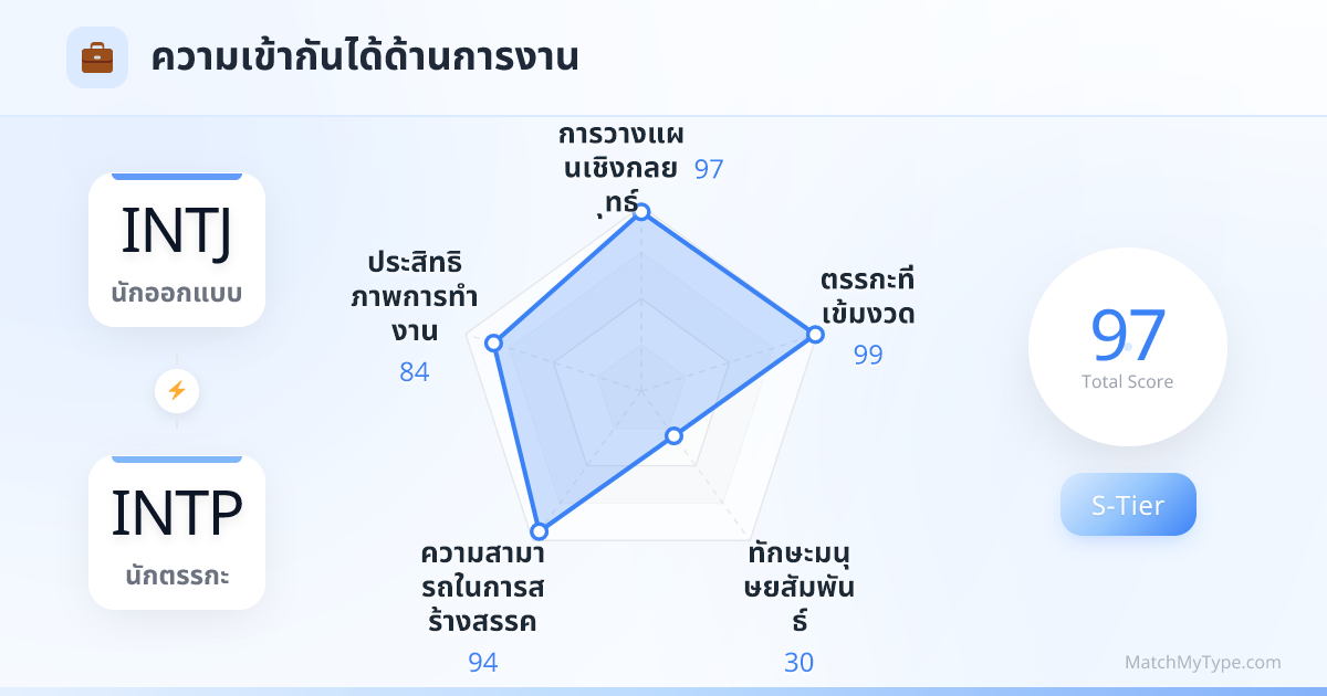 นี่คือดรีมทีมในโลกเทคโนโลยี วิชาการ และการให้คำปรึกษา INTJ รับผิดชอบการวางกลยุทธ์และควบคุมความคืบหน้า ส่วน INTP รับผิดชอบด้านเทคนิคและอุดช่องโหว่ ตราบใดที่ไม่ส่งพวกเขาไปทำประชาสัมพันธ์หรืองานบริการลูกค้า พวกเขาสามารถสร้างระบบที่สมบูรณ์แบบที่สุดได้