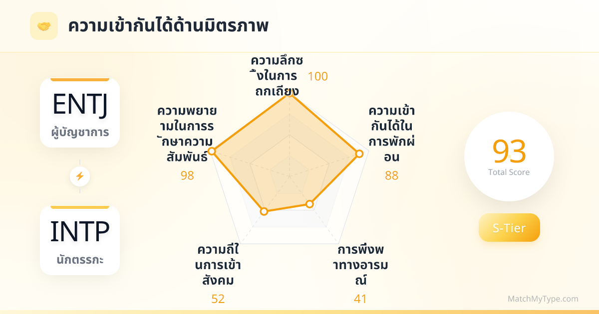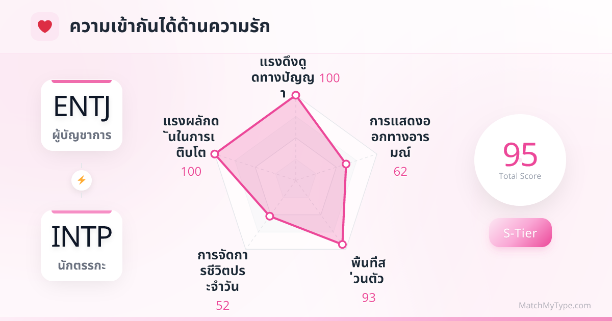 สำหรับ ENTJ และ INTP 'ความฉลาด' คือ 'ความเซ็กซี่' แบบใหม่ นี่มักไม่ใช่ความสัมพันธ์ที่โรแมนติกแบบดั้งเดิมที่เต็มไปด้วยดอกไม้และดินเนอร์ใต้แสงเทียน แต่เป็นการเฉลิมฉลองของเปลือกสมองส่วนนอก ENTJ ชื่นชมความเฉียบแหลมของ INTP ที่สามารถมองทะลุเห็นแก่นแท้ได้ในพริบตา ส่วน INTP ก็หลงใหลในออร่าของ ENTJ ที่สามารถเปลี่ยนความวุ่นวายให้เป็นระเบียบได้ คุณทั้งคู่คือหินลับมีดที่คมที่สุดของกันและกัน