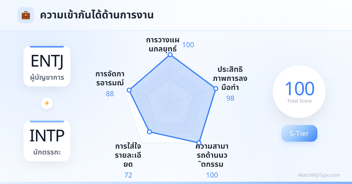 นี่คือการรวมตัวระดับ 'อาวุธนิวเคลียร์' ในที่ทำงาน หาก ENTJ คือแม่ทัพที่ขับรถศึก INTP ก็คือวิศวกรที่ออกแบบรถศึกคันนั้น ตราบใดที่เป้าหมายตรงกัน ไม่มีอุปสรรคใดขวางกั้นคู่นี้ได้