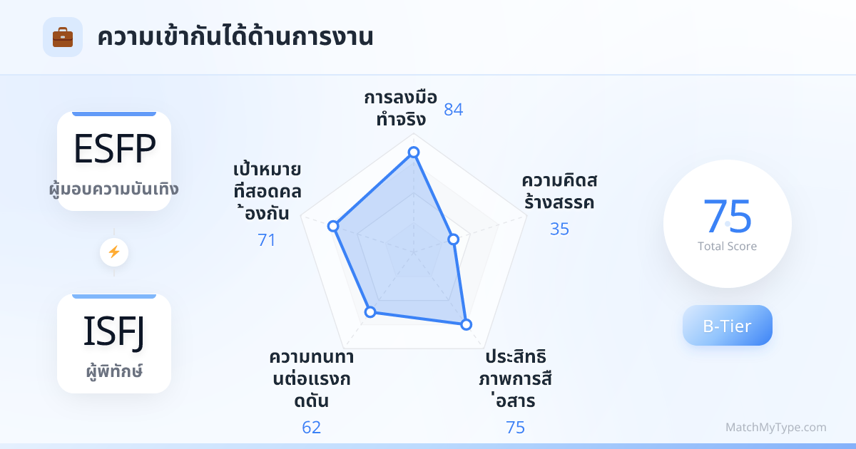 ส่งงานที่ต้อง "เจอคน พูดคุย และออกไปข้างนอก" ให้ ESFP ส่วนงานที่ต้อง "นั่งนิ่งๆ ตรวจสอบ และจัดเก็บ" ให้ ISFJ อย่าสลับหน้าที่กันเด็ดขาด