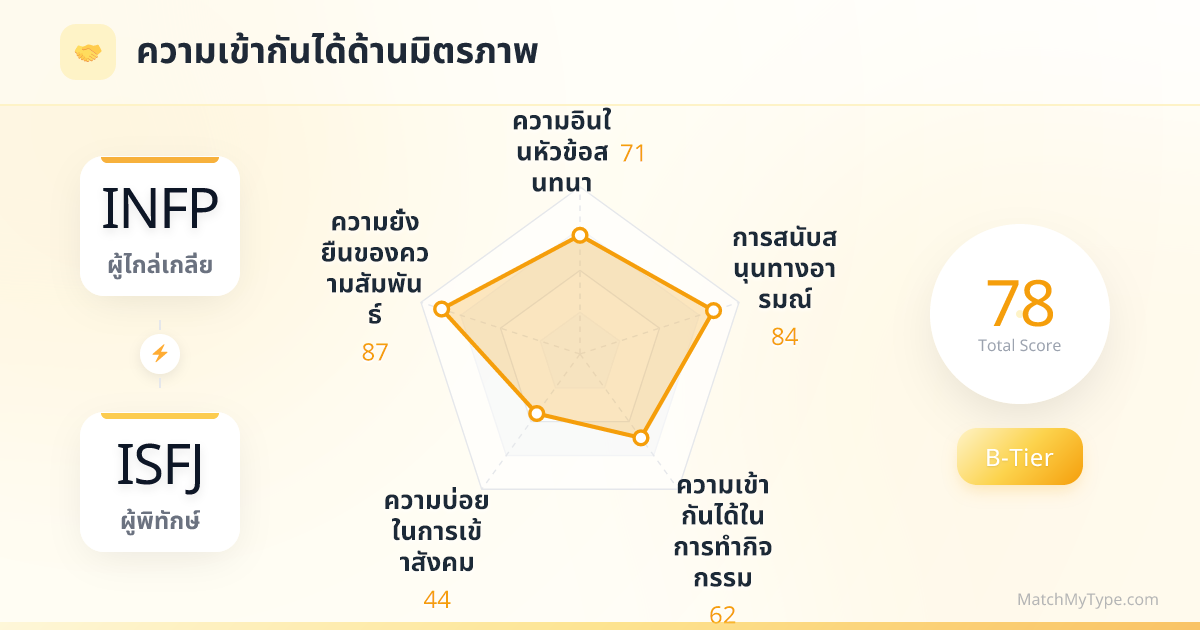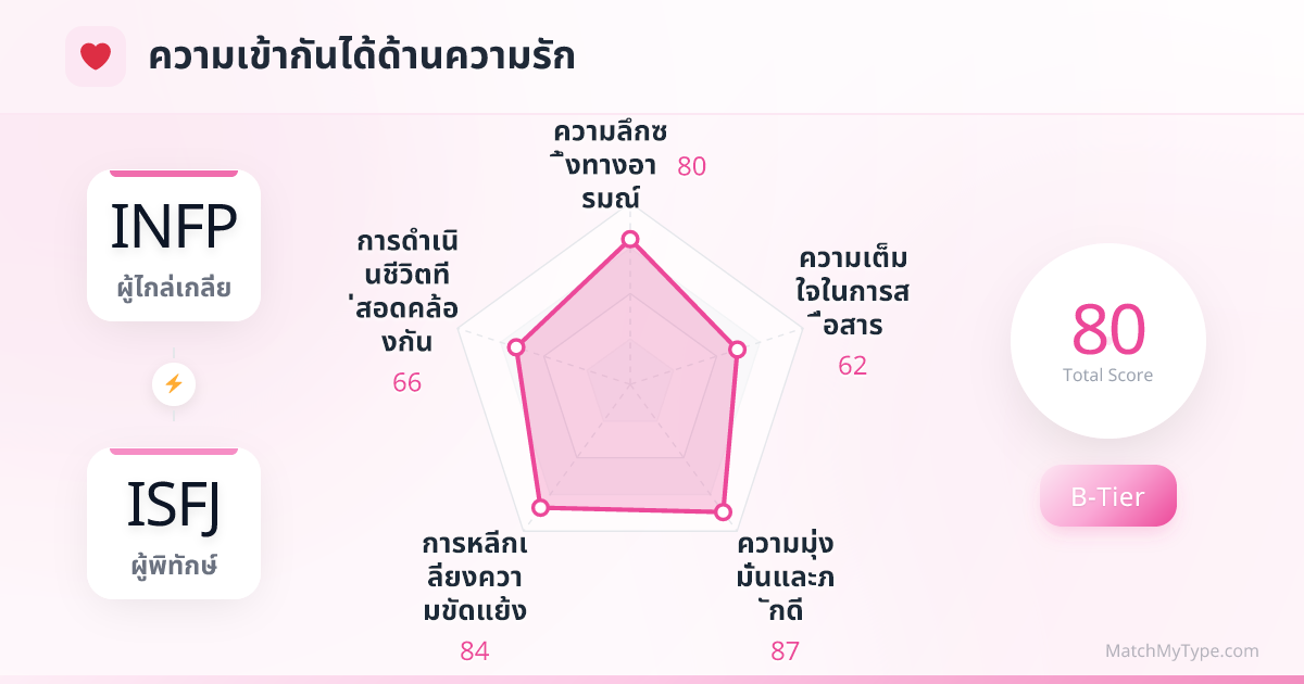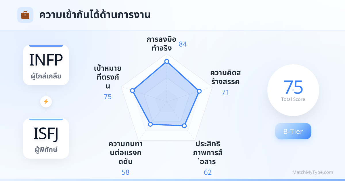 นี่คือการจับคู่สุดคลาสสิกระหว่าง 'นักฝัน' และ 'พ่อบ้าน' หากร่วมมือกันได้ดี INFP จะเป็นคนวาดแผนผังอันยิ่งใหญ่ และ ISFJ จะเป็นคนก่ออิฐทีละก้อนจนสำเร็จ หากร่วมมือกันไม่ดี INFP จะรำคาญที่ ISFJ หัวแข็ง และ ISFJ จะเบื่อที่ INFP พึ่งพาไม่ได้