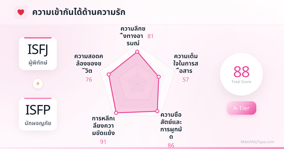 มันคือแรงดึงดูดแบบ 'คล้ายแต่ส่งเสริมกัน' ทั้งคู่เป็นคนติดดินและให้ความสำคัญกับประสบการณ์ทางประสาทสัมผัส (S) ซึ่งทำให้การเดทของพวกเขาสอดประสานกันได้ดีตั้งแต่เริ่ม ทั้งเรื่องอาหาร ภาพยนตร์ และทิวทัศน์ธรรมชาติ ISFJ จะหลงใหลในความสบายๆ ความเป็นศิลปิน และความจริงใจที่ไม่ไหลตามกระแส (Fi) ของ ISFP ซึ่งเป็นอิสระที่ ISFJ ปรารถนาแต่ไม่กล้ามี ส่วน ISFP จะประทับใจในความใส่ใจ ความพึ่งพาได้ และการดูแลอย่างละเอียดยิบ (Fe+Si) ของ ISFJ สำหรับ ISFP ที่มักจะล่องลอย ISFJ คือตัวแทนที่เป็นรูปธรรมของคำว่า 'บ้าน'