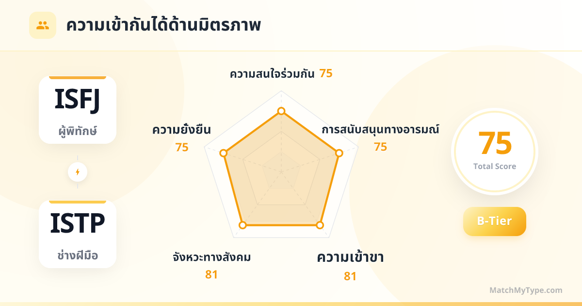 ISFJ มอบบ้านที่ ISTP อยากกลับมาเสมอไม่ว่าจะบินไปไกลแค่ไหน และ ISTP มอบแผ่นหลังที่พึ่งพาได้แม้ฟ้าจะถล่ม; นี่คือคู่หูสายปฏิบัติที่ยืนยันความรักผ่าน "การกระทำ" มากกว่า "คำพูด" ท่ามกลางชีวิตประจำวันที่เรียบง่าย