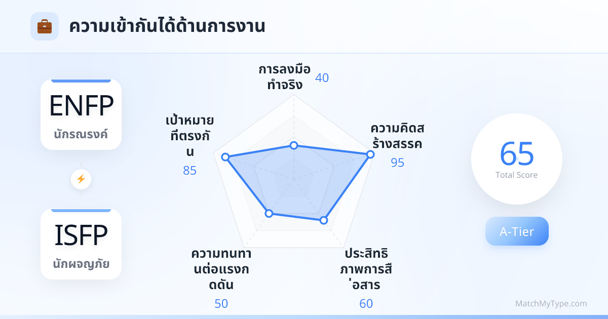 การพบกันของ ENFP และ ISFP เปรียบเสมือนการชนกันของอนุภาคอิสระสองตัว คุณทั้งคู่ขับเคลื่อนด้วย Fi (ความรู้สึกที่เน้นภายใน) ซึ่งหมายความว่าคุณไม่จำเป็นต้องใช้คำพูดมากมายก็เข้าใจในความยึดมั่นต่อ 'ความจริงใจ' และ 'ความเป็นตัวของตัวเอง' ENFP ถูกดึงดูดด้วยความลึกลับและรสนิยมของ ISFP ส่วน ISFP ก็ถูกจุดประกายด้วยความกระตือรือร้นและจินตนาการของ ENFP นี่คือความสัมพันธ์ที่เต็มไปด้วยความประหลาดใจและศิลปะ แต่อาจขาดระเบียบวินัยในบางครั้ง