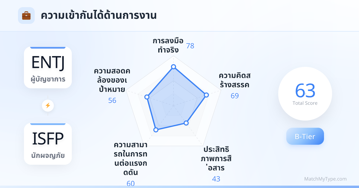 **อนาคตที่ไม่ตรงกัน**: ENTJ อยู่กับอนาคต (Ni) มักวางแผน 5 ปี 10 ปี ส่วน ISFP อยู่กับปัจจุบัน (Se) สนใจแค่ว่าเย็นนี้จะกินอะไร อย่าบังคับให้อีกฝ่ายเข้ามาอยู่ในเขตเวลาของตัวเอง