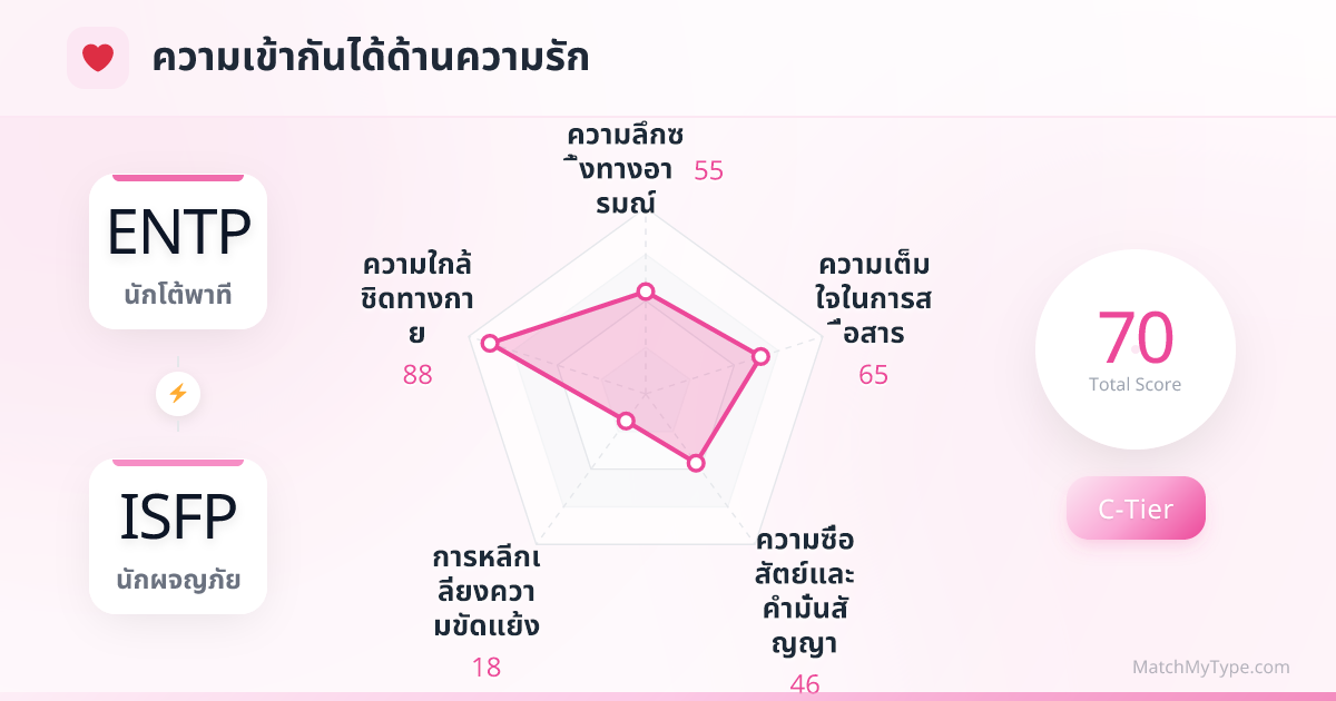 - 1**ปากไวของ ENTP**: ENTP คิดว่า 'การโต้เถียง' คือการแลกเปลี่ยนความรู้สึก แต่ ISFP มองว่าเป็นการโจมตีส่วนบุคคล ENTP ต้องจำไว้ว่า: อย่าโต้เถียงเรื่องรสนิยมหรือทางเลือกทางอารมณ์ของ ISFP