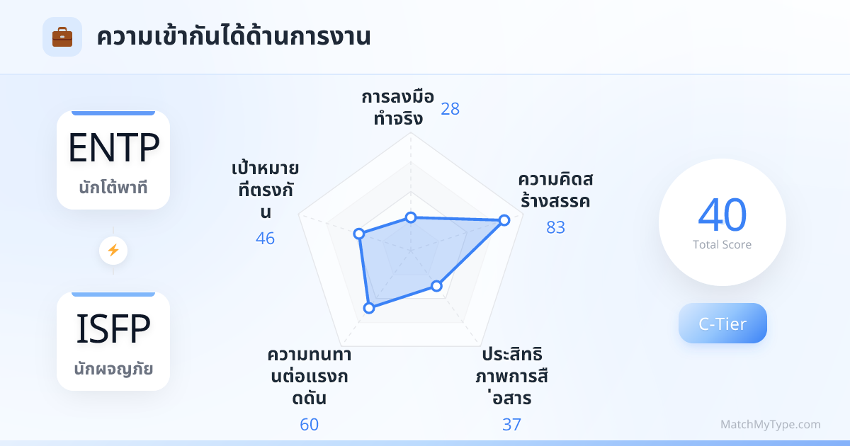 ถ้าคุณทั้งคู่เป็นทีมสตาร์ทอัพ มันจะเป็นทีมประเภท 'ไอเดียล้นทะลัก แต่การลงมือจริงขึ้นอยู่กับดวง' ENTP รับหน้าที่วาดฝัน ISFP รับหน้าที่ทำให้ฝันนั้นดูสวยงาม แต่ใครจะทำให้ฝันเป็นจริงนั้นคือปัญหาใหญ่