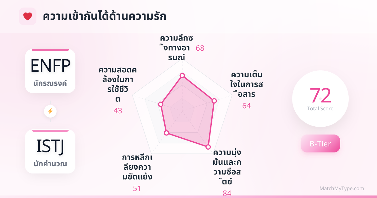 นี่คือการจับคู่แบบ "บุคลิกภาพที่สลับขั้วกัน" อย่างชัดเจน คุณทั้งคู่มีฟังก์ชันการรับรู้เหมือนกันสี่อย่าง (Ne, Fi, Te, Si) แต่ลำดับความสำคัญสลับกันอย่างสิ้นเชิง ซึ่งหมายความว่าในระดับค่านิยมส่วนลึกคุณมีความเป็นหนึ่งเดียวกัน แต่การแสดงออกกลับเหมือนมาจากคนละดวงดาว ENFP คือความบ้าคลั่งที่ ISTJ เคยเก็บกดไว้ ส่วน ISTJ คือความมั่นคงที่ ENFP โหยหา