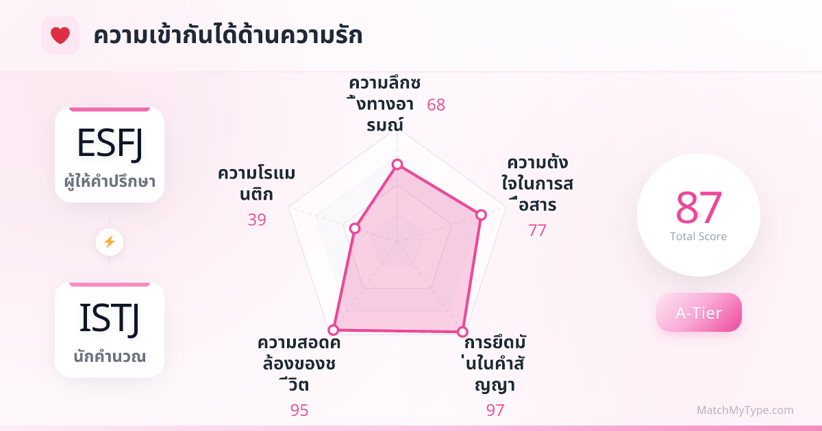 หัวใจสำคัญของการรวมตัวนี้อยู่ที่การประสานกันของ **Si (Introverted Sensing)** และการปะทะกันระหว่าง **Fe (Extraverted Feeling) vs Te (Extraverted Thinking)** **Si x Si (การรวมพลังที่แข็งแกร่ง)**: คุณทั้งคู่เป็นผู้ใช้ Si ระดับสูง ซึ่งหมายความว่าคุณให้ความสำคัญกับอดีต ประเพณี ประสบการณ์ และรายละเอียดมาก คุณจะจำวันครบรอบได้ทุกวัน บ้านจะสะอาดสะอ้านเสมอ และสถานะทางการเงินจะมั่นคง สิ่งนี้สร้างความสอดคล้องในชีวิตประจำวันที่สูงมาก **Fe x Te (การดึงดันระหว่างเหตุผลและอารมณ์)**: นี่คือที่มาของความขัดแย้ง ESFJ (Fe) ตัดสินใจโดยพิจารณาว่า 'ทุกคนมีความสุขไหม' หรือ 'จะเสียความรู้สึกไหม' ในขณะที่ ISTJ (Te) ตัดสินใจโดยพิจารณาว่า 'มันมีประสิทธิภาพไหม' หรือ 'สมเหตุสมผลไหม' ESFJ อาจรู้สึกว่า ISTJ เลือดเย็นเหมือนหุ่นยนต์ ส่วน ISTJ อาจรู้สึกว่า ESFJ ใช้อารมณ์เกินไป ขาดตรรกะ หรือแคร์สายตาคนอื่นมากเกินไป