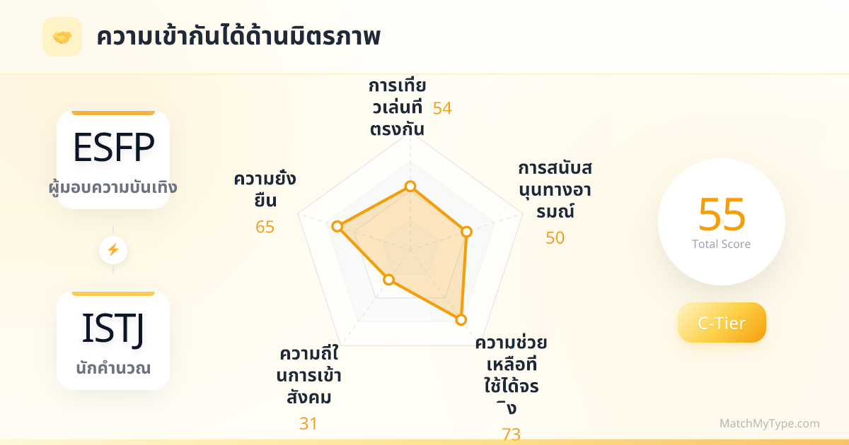 - 2**ความต้องการทางสังคมที่ไม่เท่ากัน**: ESFP อยากจัดปาร์ตี้ช่วงสุดสัปดาห์ แต่ ISTJ อยากอยู่บ้านเงียบๆ เพื่อชาร์จพลัง หากบังคับให้ ISTJ เข้าสังคม พวกเขาจะทำหน้าบึ้งตึงตลอดงาน ทำให้ ESFP เสียหน้า