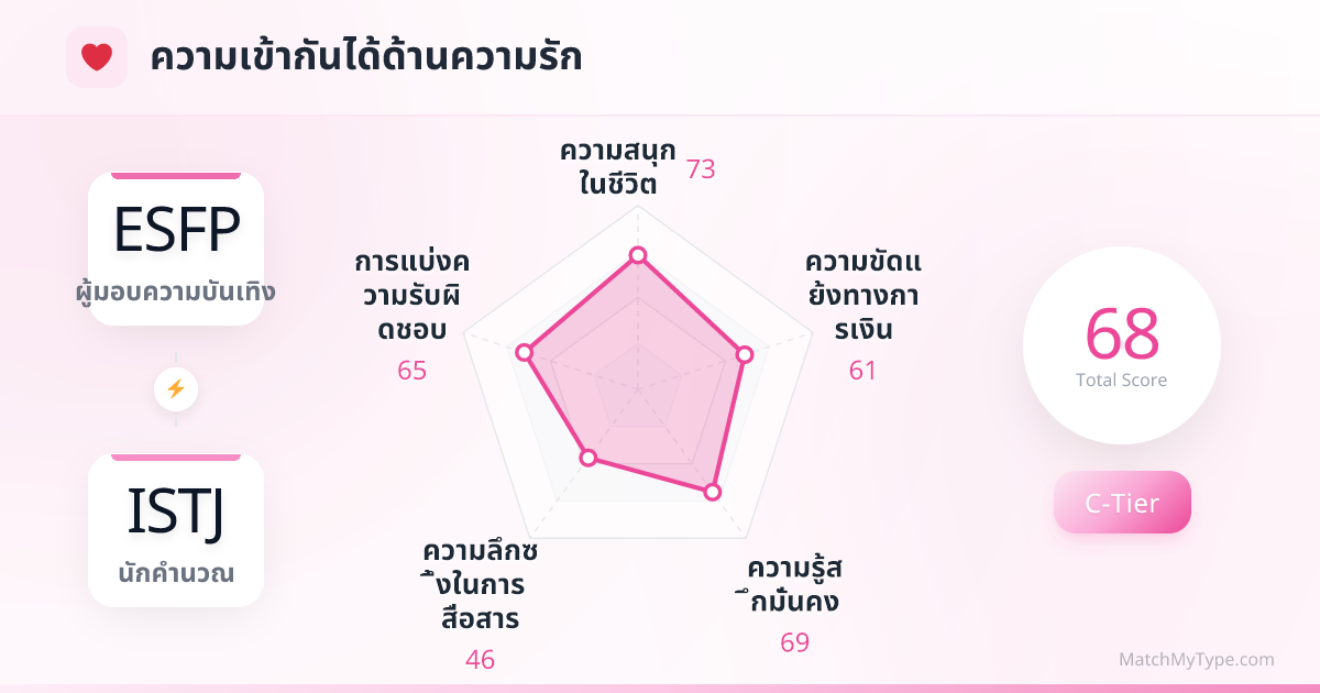 - 3**การสื่อสารที่ขวานผ่าซาก**: ISTJ พูดจาตรงไปตรงมาเกินไปจนอาจละเลยอารมณ์ของ ESFP ที่ต้องการคำปลอบโยน ส่วน ESFP เมื่อระเบิดอารมณ์ ISTJ มักจะตัดสินว่ามันเป็น 'การตีโพยตีพายไร้สาระ'