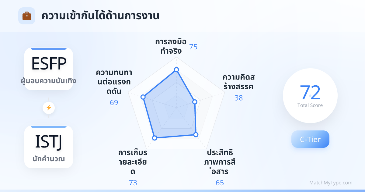 เป็นการจับคู่ 'หน้าบ้านและหลังบ้าน' ที่สมบูรณ์แบบ ESFP มีความสามารถในการนำเสนอและทักษะทางสังคมที่ยอดเยี่ยม เหมาะกับงานขาย ประชาสัมพันธ์ หรืองานอีเวนต์ ส่วน ISTJ มีตรรกะที่ละเอียดถี่ถ้วนและการใส่ใจรายละเอียดอย่างยิ่งยวด เหมาะกับงานบัญชี การดำเนินงาน หรือการควบคุมความเสี่ยง เมื่อ ESFP หาลูกค้ามาได้ ISTJ จะเป็นคนส่งมอบคุณภาพงาน เป็นวงจรที่สมบูรณ์