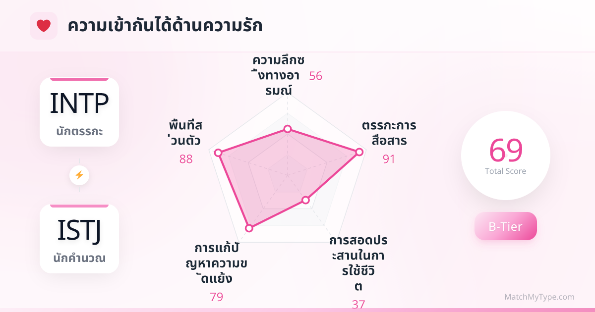 นี่ไม่ใช่ความรักที่เต็มไปด้วยดอกไม้ เทียน และการสารภาพรักที่น่าตื่นเต้น แต่เหมือนกับการทดลองระยะยาวว่า 'จะอยู่ร่วมกันอย่างมีประสิทธิภาพได้อย่างไร' ทั้ง INTP และ ISTJ ไม่เก่งในการจัดการกับอารมณ์ แต่ต่างก็ให้ความสำคัญกับความซื่อสัตย์ ตรรกะ และพันธสัญญาอย่างมาก ความรักของพวกคุณไม่ได้แสดงออกผ่านคำว่า 'ฉันรักเธอ' แต่แสดงออกผ่านการช่วยซ่อมคอมพิวเตอร์ หรือการช่วยจัดเตรียมเอกสารภาษี ซึ่งเป็นการกระทำที่จับต้องได้จริง