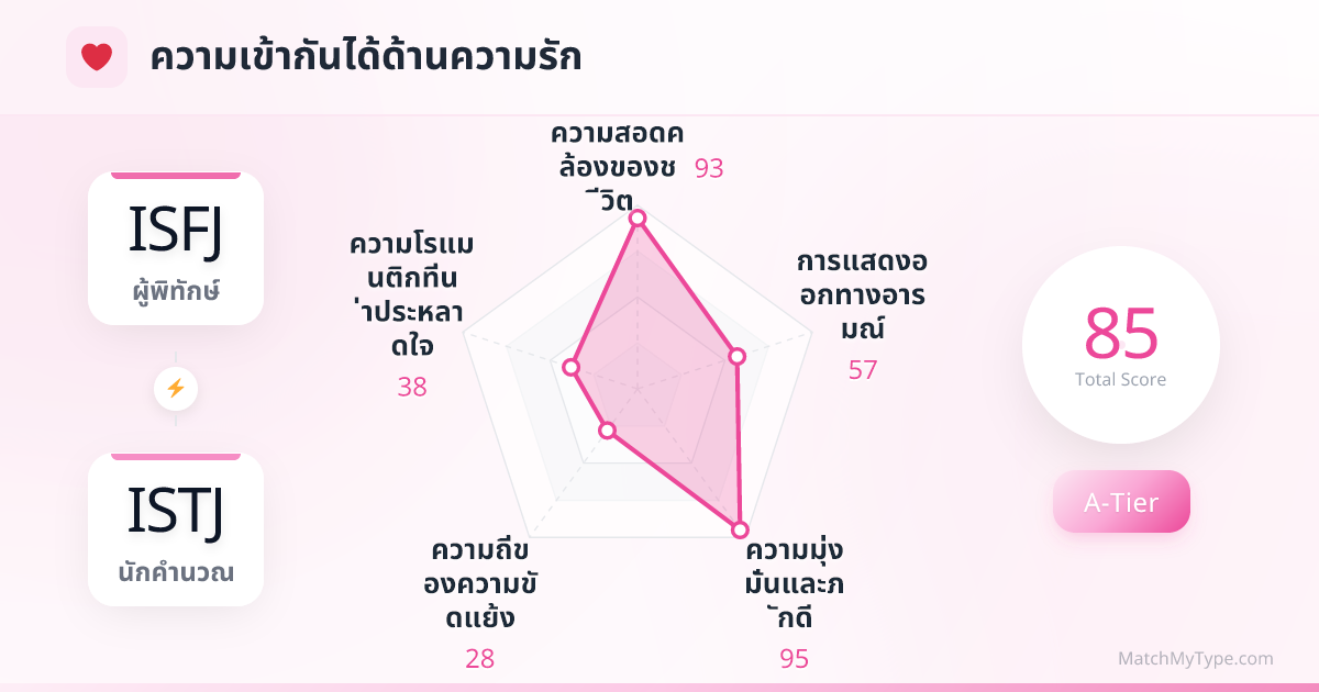 นี่ไม่ใช่ความรักแบบรถไฟเหาะ แต่เป็นรถไฟความเร็วต่ำที่วิ่งผ่านทุ่งราบ ทัศนียภาพนอกหน้าต่างอาจจะดูเรียบง่าย แต่ปลอดภัย ตรงเวลา และสะดวกสบายอย่างยิ่ง ISFJ และ ISTJ ต่างแบ่งปันการแสวงหาความ 'มั่นคง' ขั้นสูงสุด พวกเขาสามารถสร้างฐานทัพครอบครัวที่แข็งแกร่งที่สุดได้